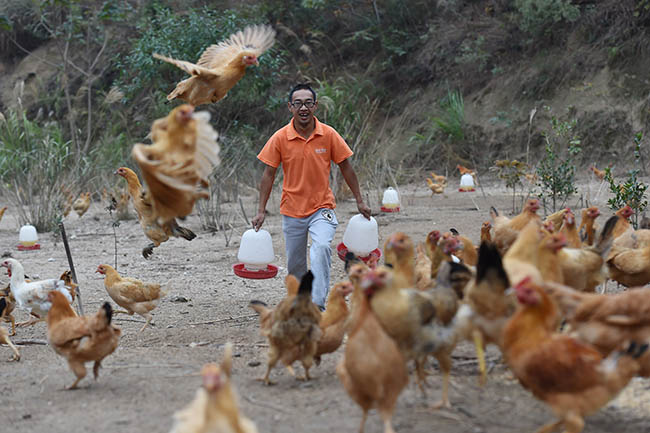 安徽岳西農(nóng)村淘寶合伙人楊凱林路過村民的雞場時幫著送水(照片由本人提供)