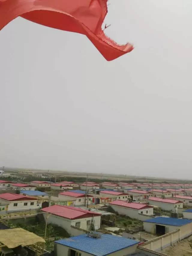 前年春天栽的楊樹四五米高了,村莊四周是連綿起伏到遙遠(yuǎn)的沙丘,這是和田入夏以來最熱的一天,氣溫超過四十度,沙塵天下紅屋頂藍(lán)屋頂?shù)拇迩f好像建立在荒蕪的外星球上一樣,令人產(chǎn)生了夢幻感。