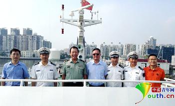 日前,著名軍事專家、中國戰略文化促進會常務副會長兼秘書長羅援少將(左3)登上中國海監船,為海監隊員助威。