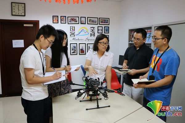 陸紅與創客空間部分成員探討無人機模型。中國青年網記者 李川 攝