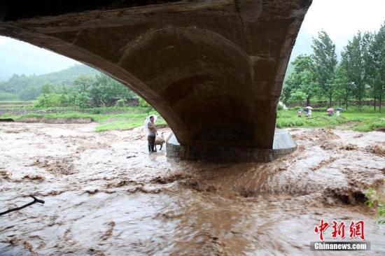 7月19日下午,河南省濟源市,受強降雨影響,當地九里溝河水猛漲,一名正在九里溝引沁渠橋下放羊的村民和20多只山羊,被猛漲的洪水困在河道,無法回到岸上。現場,滾滾河水沖擊著橋墩,發出轟隆隆的響聲,水位還在不斷上漲,情形十分危急。當地消防迅速出動,在洪水里救人又救羊。 古少杰 攝