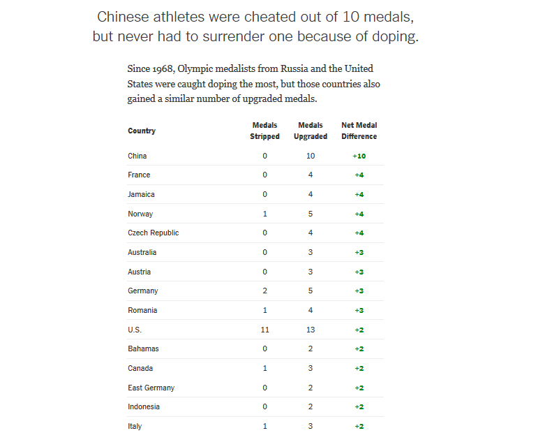 《紐約時報》公布了一組官方數據,奧運獎牌獲得者中被發現使用興奮劑最多的是俄羅斯和美國。而中國從沒因為興奮劑問題被剝奪任何一塊獎牌。相反,中國是被“騙走”獎牌最多的國家,有10位中國選手因為對手嗑藥被“偷走”獎牌。