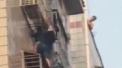 千鈞一發(fā)之際,一名30歲左右的男子沖出人群,將鞋一脫,背包一甩,沿著防護(hù)欄不到兩分鐘就徒手爬上了五樓,并迅速移動到男孩身邊。熱心男子雙腳踩著五樓的防盜網(wǎng),左手拉著防盜網(wǎng)借力,右手不停敲擊卡著男孩的六樓防盜網(wǎng),并試圖將孩子推上去。