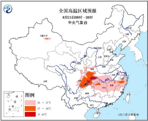 中新網8月21日電 據中央氣象臺網站消息,8月20日06時繼續發布高溫黃色預警:預計,20日白天,陜西關中及南部地區、甘肅南部、四川盆地、重慶、江漢大部、江淮南部、江南大部、貴州東北部、廣西北部和南疆盆地東北部等地有35℃以上的高溫天氣。
