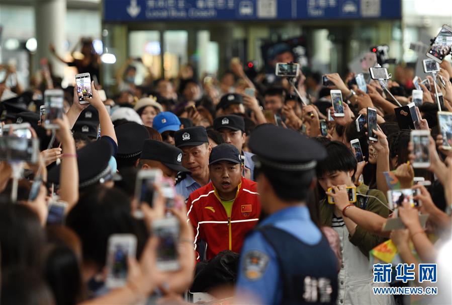 8月20日,中國乒乓球隊總教練劉國梁(中)抵達北京首都國際機場。 當日,參加里約奧運會的中國乒乓球隊抵達北京首都國際機場。新華社記者鞠煥宗攝