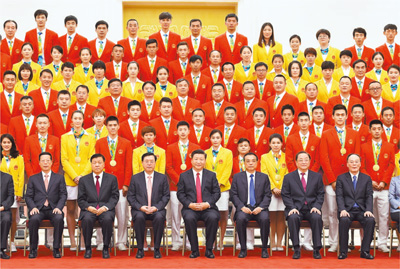 8月25日,黨和國(guó)家領(lǐng)導(dǎo)人習(xí)近平、李克強(qiáng)、張德江、俞正聲、劉云山、王岐山、張高麗等在北京人民大會(huì)堂會(huì)見(jiàn)第31屆奧林匹克運(yùn)動(dòng)會(huì)中國(guó)體育代表團(tuán)全體成員。新華社記者蘭紅光攝