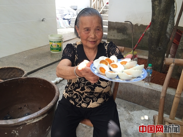 瑞金市壬田鎮鳳崗村,“鴨蛋代言人”廖奶奶向大家展示自家制作的鴨蛋。中國網記者 尚陽 攝