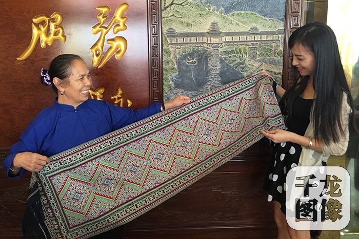 8月30日,國家級非遺項目侗錦代表性傳承人粟田梅和侄女一起向記者展示侗錦產品。侗錦自古以來以母女間傳承為主,一方侗錦,連接起兩代侗家女對這項傳統技藝生生不息的熱愛。千龍網記者 包萌 攝