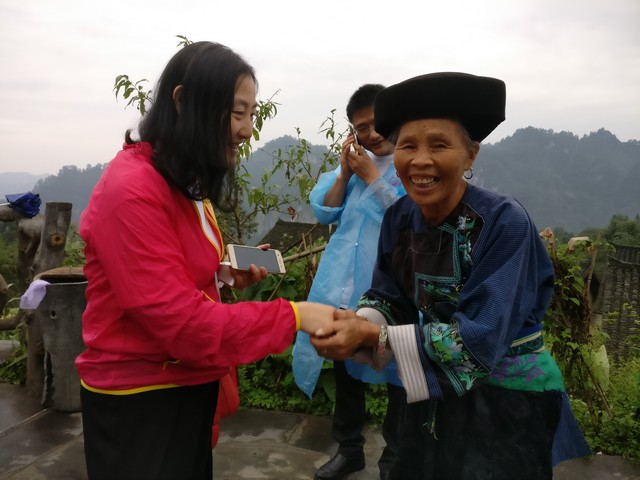 76歲的的苗族老人龍德成家里開起了農家樂和網店,從此過上了好日子。老人開心的和記者握手。