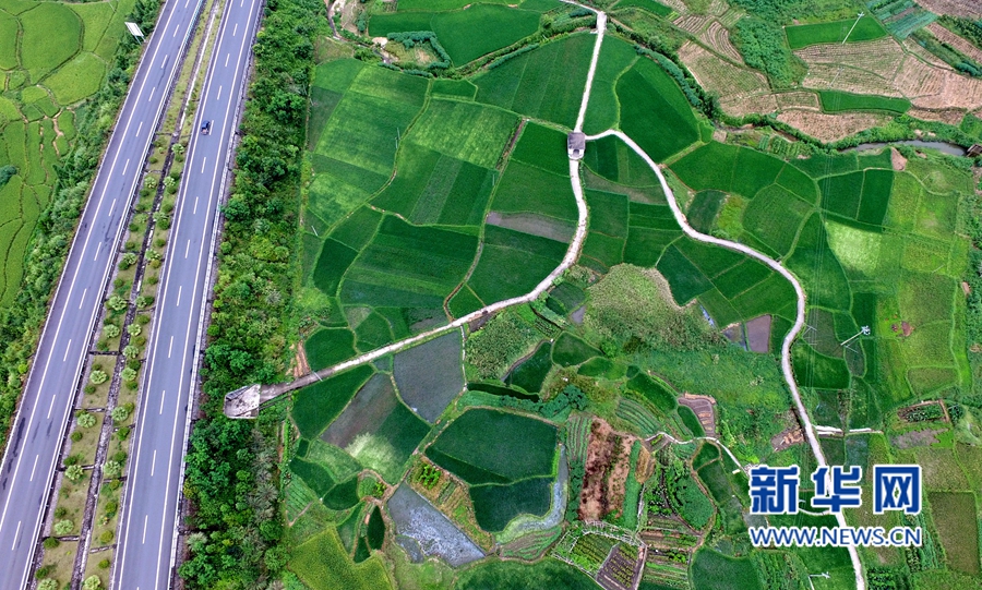 新泉鎮隸屬福建省連城縣管轄,是閩、粵、贛三省的交通要沖。圖為美麗的田園風光與高速公路相映成趣。