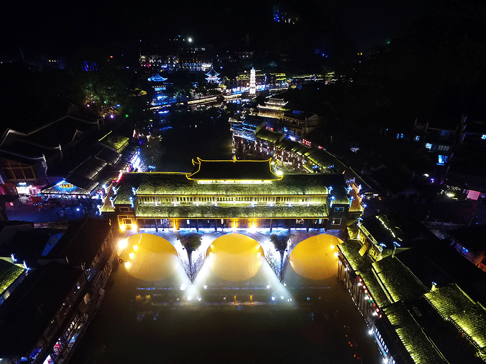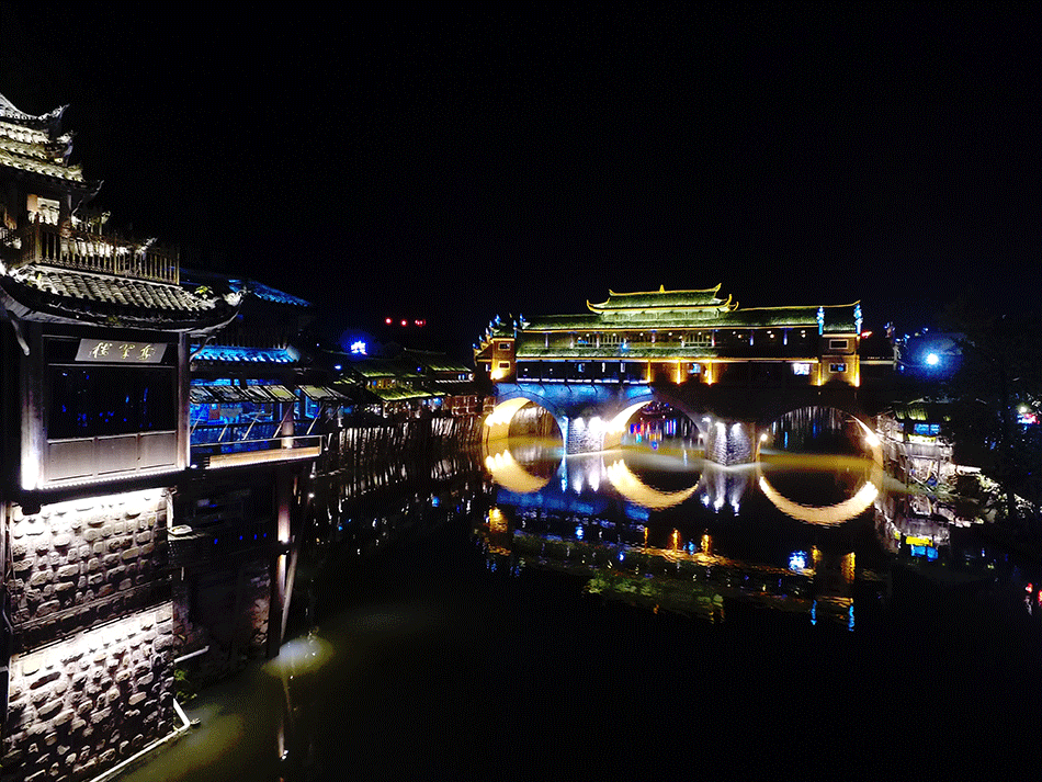虹橋旁的吊腳樓均分上下兩層,,俱屬五柱六掛或五柱八掛的穿斗式木結(jié)構(gòu),是鳳凰古城具有濃郁苗族建筑特色的古建筑群之一。新華網(wǎng) 王超攝