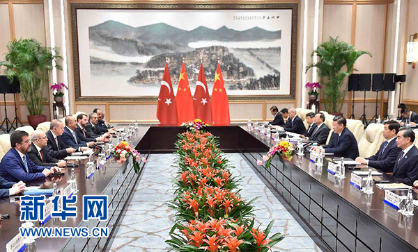 9月3日,國家主席習近平在杭州會見來華出席二十國集團領導人杭州峰會的土耳其總統埃爾多安。 新華社記者 李濤 攝