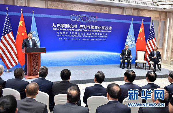 9月3日下午,中國國家主席習(xí)近平和美國總統(tǒng)奧巴馬先后向聯(lián)合國秘書長潘基文交存氣候變化《巴黎協(xié)定》批準(zhǔn)文書。