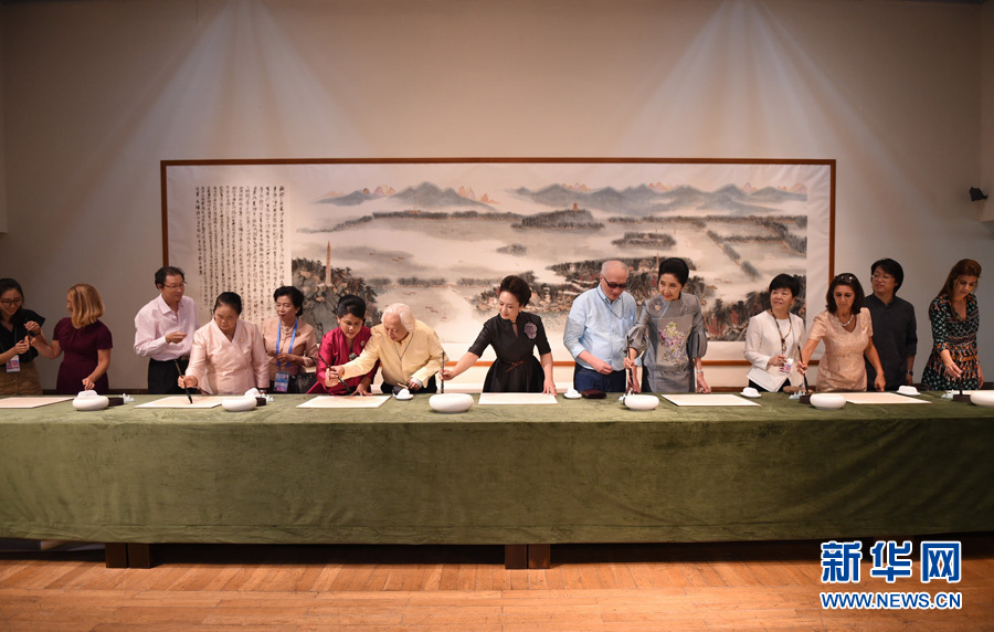 9月5日,國家主席習近平夫人彭麗媛邀請出席二十國集團領導人杭州峰會外方代表團團長夫人參觀中國美術學院。這是彭麗媛與來賓一同書寫漢字“和”。新華社記者 謝環(huán)馳 攝