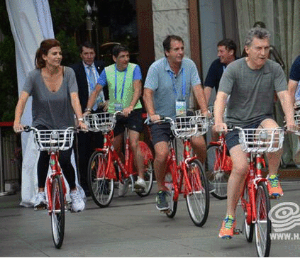 阿根廷總統馬克里在岸邊騎杭州公共自行車