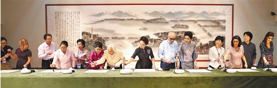 最后,彭麗媛邀請來賓們一同書寫漢字“和”。她說,“和”字在漢語里具有“和平”、“和諧”之義,是我們對世界的共同心愿。