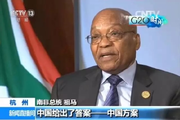 南非總統祖馬表示,作為非洲國家的代表,他很贊同G20杭州峰會上習主席提出的全球治理的中國方案,他認為這不僅會促進非洲經濟的增長,也為全球經濟增長做出貢獻。