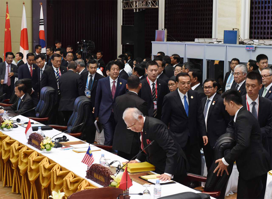 國務院總理李克強當地時間7日下午在萬象國家會議中心出席第十九次東盟與中日韓(10+3)領導人會議,東盟十國領導人以及日本首相安倍晉三、韓國總統樸槿惠共同出席。老撾總理通倫主持會議。圖為各國領導人入場。