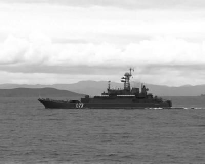 蟾蜍級坦克登陸艦,舷號077,1975年服役,是蘇聯在1965年開始建造的首批大型登陸艦鱷魚級基礎上發展起來的坦克登陸艦,滿載排水量4080噸,艦長112.5米,艦寬15米,航速18節,最大續航力6000海里,可搭載482噸貨物。可搭載10輛主戰坦克或12輛裝甲車,另外還包括300名左右的士兵。配備4座艦空導彈發射裝置,1座76毫米單管艦炮,2座30毫米六管艦炮,122毫米火箭發射裝置和反蛙人火箭筒。
