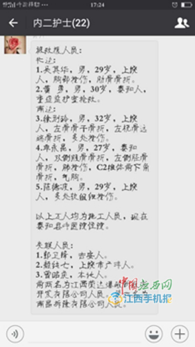 已獲救人員名單:橋北邊:1。吳其華,男,29歲,上饒人,胸部挫傷,肋骨骨折。2。黃 勇,男,30歲,泰和人,重癥監護室搶救。