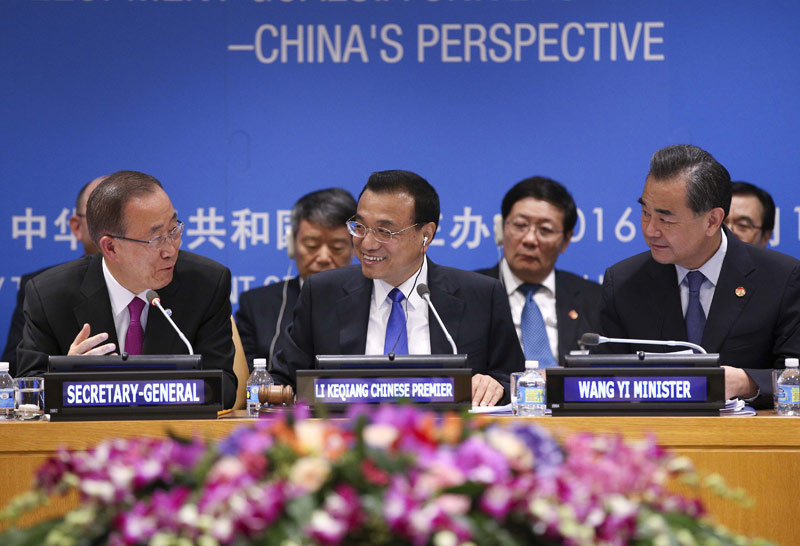 李克強當(dāng)?shù)貢r間19日在聯(lián)合國主持召開“可持續(xù)發(fā)展目標(biāo):共同努力改造我們的世界——中國主張”座談會,聯(lián)合國秘書長、71屆聯(lián)大主席及16個國際組織負責(zé)人悉數(shù)出席。潘基文盛贊道:“我很少在一個會場看到這么多國際組織的負責(zé)人。這充分說明了李克強總理的領(lǐng)導(dǎo)力。”