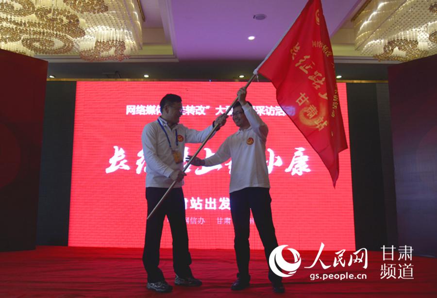 “長征路上奔小康”網絡媒體“走轉改”采訪活動甘肅站啟動。圖為授旗儀式 (郭頌霞 攝)