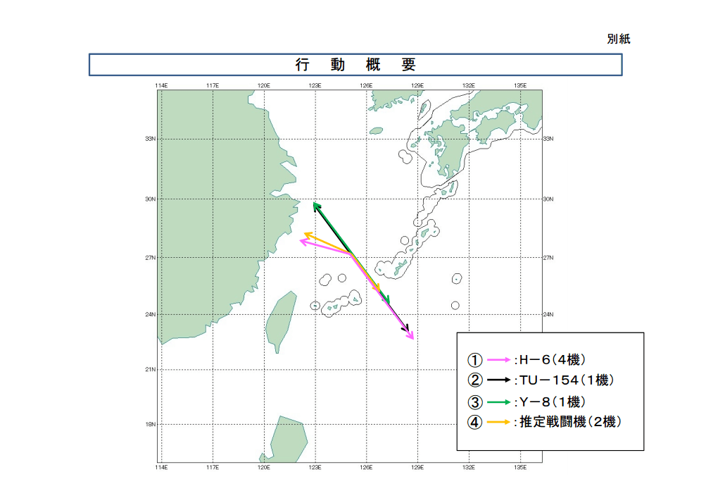 根據日本防衛省統合幕僚監部9月25日當天發布的公告顯示,25日當天共有8架中國軍機出現在東海空域。8架軍機分別為4架H-6戰略轟炸機、1架TU-154電子偵察機、1架Y-8偵察機。另外2架軍機據推斷可能是中國空軍戰機。