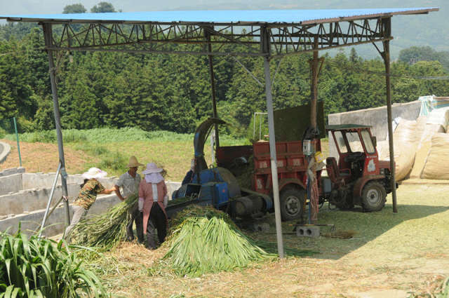 7月24日,晴隆羊繁育中心工作人員正在加工飼草。新華社記者 李春惠 攝