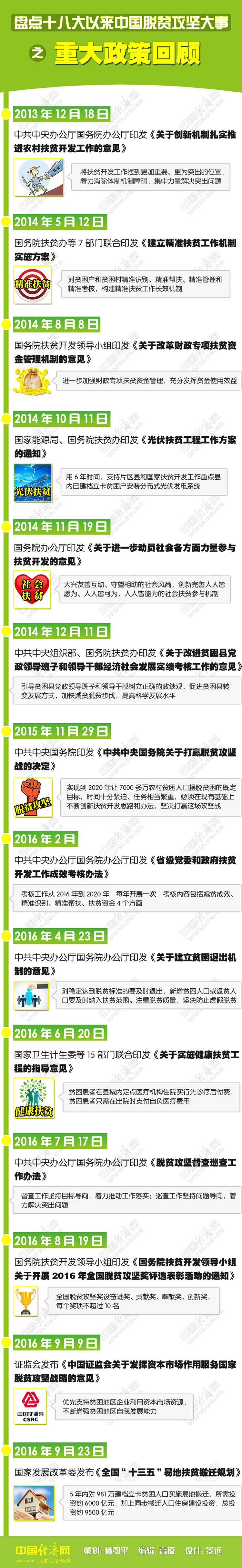 中國經(jīng)濟(jì)網(wǎng)策劃制作系列圖解“盤點十八大以來中國脫貧攻堅大事”。“大事”分三部分:第一部分“總書記說了啥”;第二部分“標(biāo)桿活動回眸”;第三部分為“重大政策回顧”。今日推出《盤點十八大以來中國脫貧攻堅大事之重大政策回顧》。