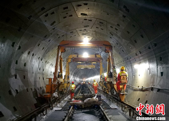 資料圖:成都城區駟馬橋地鐵7號線工地,工人正在進行鋪軌作業。中新社記者 劉忠俊 攝