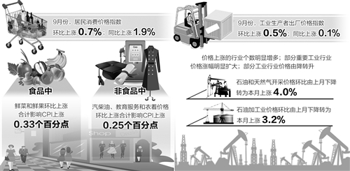 9月份CPI同比上漲1.9%,雖連續(xù)4個月處于“1時代”,但已比上月同比漲幅提高0.6個百分點,是連續(xù)4個月下降后的首次上漲。業(yè)內(nèi)專家預(yù)計,四季度物價或小幅抬升,但幅度有限。同時,PPI同比上漲0.1%,4年半來首次由負轉(zhuǎn)正——