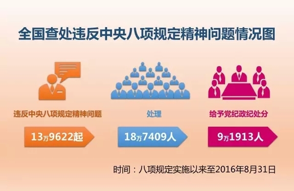 八項規定實施以來,截至2016年8月31日,全國已累計查處違反中央八項規定精神問題139622起、處理187409人,給予黨紀政紀處分91913人。