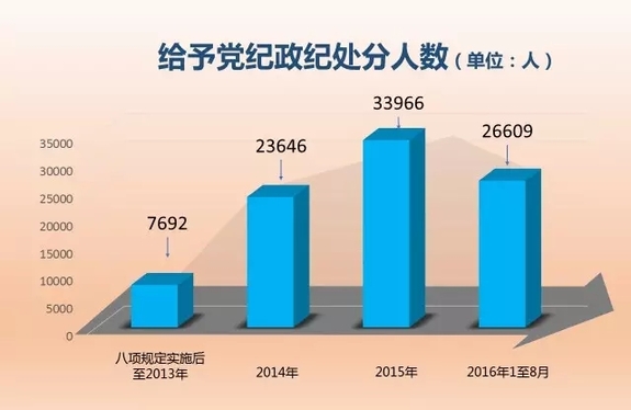 八項規定實施后至2013年末,全國共給予黨紀政紀處分7692人。2014年處分23646人,增2倍。2015年處分33966人,較上一年增長44%。2016年1至8月處分26609人,已超過2014年全年總數。數據變化的背后體現了紀檢監察機關加大查處力度,越往后執紀越嚴的要求。