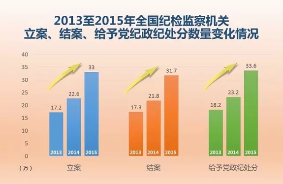 從十八屆中央紀委三次、五次、六次全會報告公布的數據看,2013年,全國紀檢監察機關共立案17.2萬件,結案17.3萬件,給予黨紀政紀處分18.2萬人。2014年,全國紀檢監察機關共立案22.6萬件,結案21.8萬件,給予黨紀政紀處分23.2萬人。2015年,全國紀檢監察機關共立案33萬件,結案31.7萬件,給予黨紀政紀處分33.6萬人。據日前中央紀委通報的2016年前三季度全國紀檢監察機關紀律審查數據,2016年1—9月,全國紀檢監察機關立案29萬件,處分26萬人。
