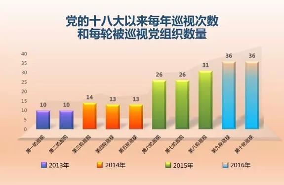 2013年,2輪中央巡視20個巡視對象;2014年,3輪巡視40個巡視對象;2015年,3輪巡視83個巡視對象;2016年,僅前2輪巡視已經覆蓋64個巡視對象,同時對巡視過的8個省市進行“回頭看”。中央巡視利劍頻頻出鞘,節奏明顯加快。
