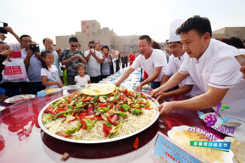 天山網訊(記者孟根傲德報道)“歡迎大家品嘗穆沙子清真食堂的超大份拌面!”在第四屆新疆(托克遜)拌面文化旅游節上,直徑一米的大盤子里50公斤的拌面被食堂的負責人周軍端了上來。“大家別客氣!”周軍賣力地推銷著自家的超大份拌面。
