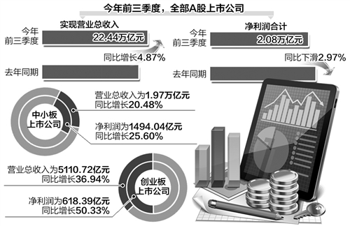 而據東方財富Choice數據統計,今年前3季度,全部A股上市公司實現營業總收入22.44萬億元,同比增長4.87%;凈利潤合計為2.08萬億元,同比下滑2.97%。中小板上市公司今年前3季度的營業總收入為1.97萬億元,同比增長20.48%;凈利潤為1494.04億元,同比增幅為25.60%。創業板上市公司今年前3季度實現營業收入5110.72億元,同比增長36.94%;凈利潤為618.39億元,同比增長50.33%。