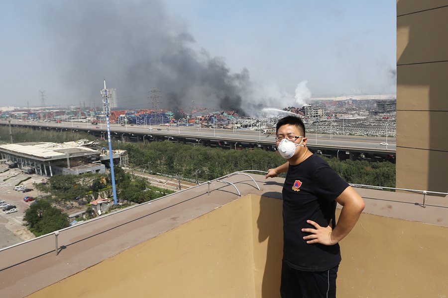 2015年8月12日,天津濱海新區一處集裝箱碼頭發生爆炸后,李拓前往爆炸現場附近進行采訪。