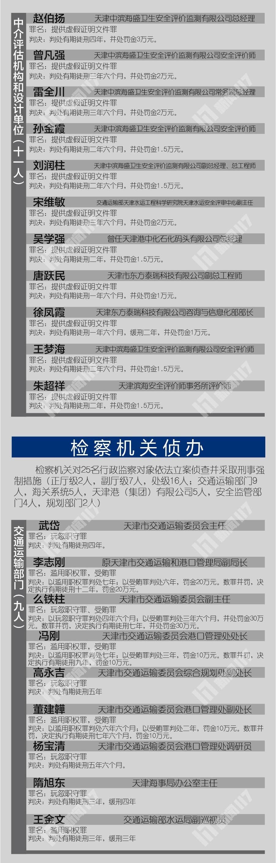 天津交通運輸委員會主任武岱等25名國家機關工作人員分別被以玩忽職守罪或濫用職權罪判刑,其中原天津市交通運輸和港口管理局副局長李志剛等6人同時犯受賄罪,予以數罪并罰。