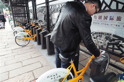 2015年12月8日,浙江烏鎮,一位游客正在通過掃描二維碼,租賃自行車。新京報記者 李冬 攝