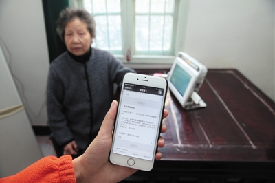 2015年12月8日,烏鎮獨居老人楊麗娟在家中使用帶有網絡功能的儀器測量血壓。新京報記者 李冬 攝