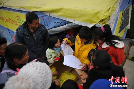 資料圖:2015年2月7日,云南魯?shù)辇堫^山鎮(zhèn),社工向安置點(diǎn)民眾發(fā)放溫暖包。中新社發(fā) 劉冉陽(yáng) 攝