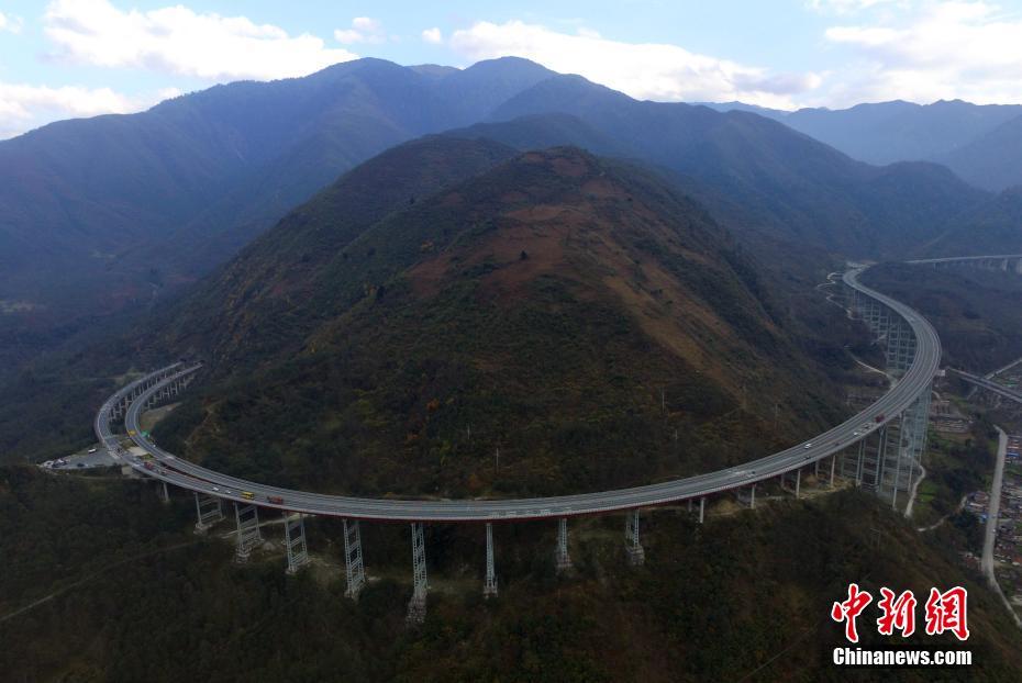 11月12日,在四川省雅安市拖烏山境內俯瞰雅西高速上的“雙螺旋隧道”,猶如巨型“過山車”一般。該工程屬于中國國內首座高速螺旋隧道,而作為螺旋隧道最重要的組成部分—干海子特大橋建于海拔2500米上,橋總長1811米,設計寬度24.5米,共36跨,最高橋墩高達110米。 干海子特大橋創下四項“世界第一”,包括第一座最長全鋼管混凝土桁架梁橋;第一座最高的鋼管混凝土格構橋墩、組合橋墩、混合橋橋墩;同類結構中每聯最長的連續結構;第一次全面采用鋼纖維鋼管混凝土施工。其造價約為每公里1.1億元人民幣。張浪 攝