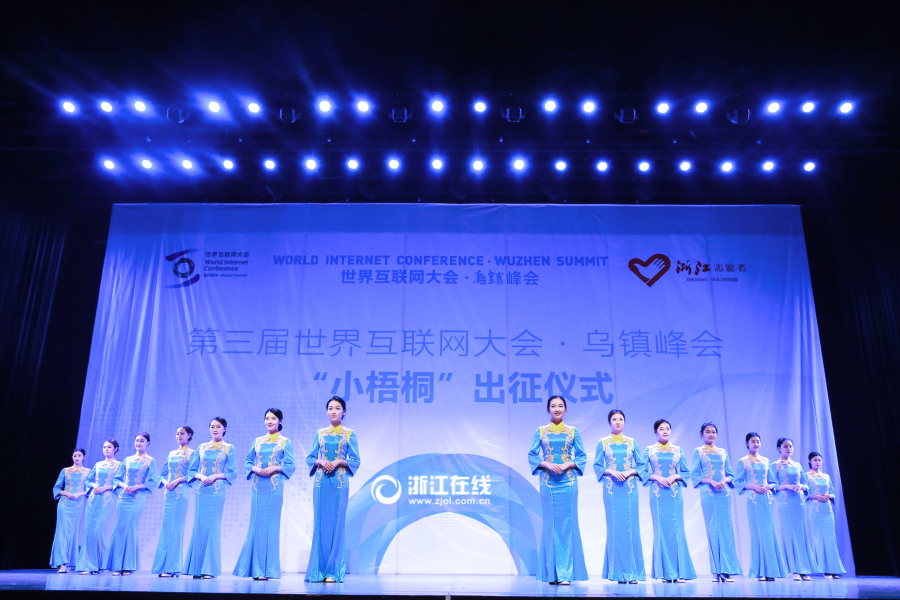 11月12日上午,浙江桐鄉,第三屆世界互聯網大會烏鎮峰會志愿者出征儀式,“小梧桐”志愿者身著新裝閃亮登場。