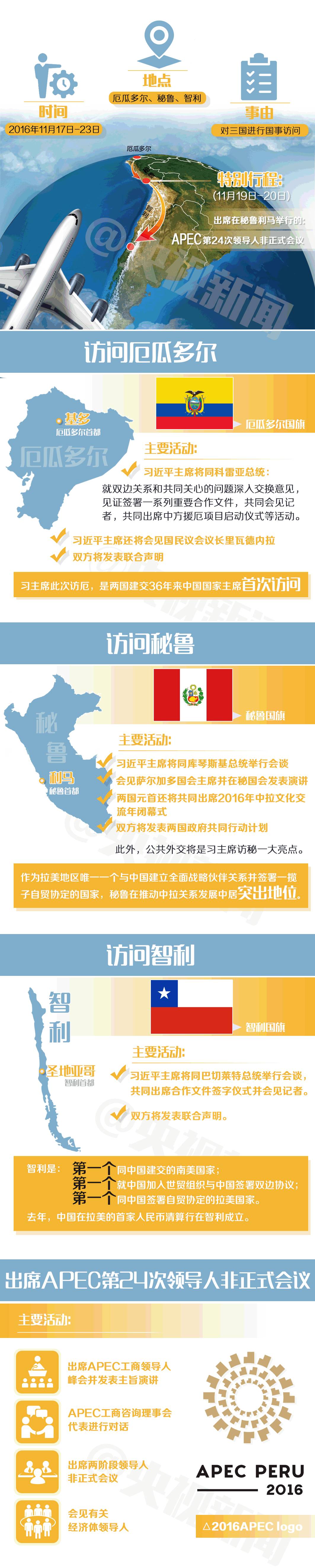 11月16日,國家主席習近平乘專機離開北京,對厄瓜多爾、秘魯、智利進行國事訪問并出席在秘魯利馬舉行的亞太經合組織第二十四次領導人非正式會議。這是習主席第三次訪問拉美國家。