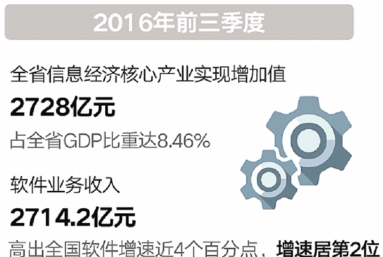 2016年前三季度,全省信息經濟核心產業實現增加值2728億元,同比增長14.1%,比去年同期提高0.9個百分點,比全省GDP增幅高6.6個百分點,占全省GDP比重達8.46%,比去年同期提高0.92個百分點;規上信息經濟核心產業實現主營業務收入7997.9億元、利稅總額1349.0億元、利潤總額1107.8億元,分別增長17.2%、25.8%和28.9%;實現軟件業務收入2714.2億元,同比增長18.5%,高出全國軟件增速近4個百分點,增速居第2位。
