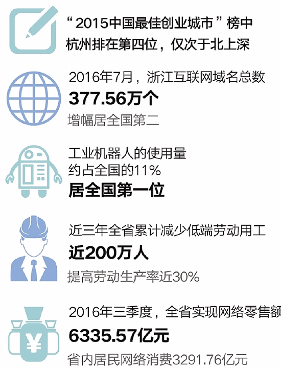 浙江是“信息化和工業化深度融合”國家級示范區,全省工業機器人的使用量約占全國的11%,居全國第一位,近三年全省累計減少低端勞動用工近200萬人,提高勞動生產率近30%。電子商務、智慧物流繼續保持快速發展,2016年三季度,全省實現網絡零售額6335.57億元、省內居民網絡消費3291.76億元,分別同比增長34.21%和28.6%。