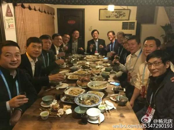 澎湃新聞(www.thepaper.cn)發(fā)現(xiàn),今年的互聯(lián)網(wǎng)頂級飯局陣容強(qiáng)大,出現(xiàn)在照片中的共有17人。其中包括:網(wǎng)易董事局主席兼CEO丁磊、新浪董事長兼CEO曹國偉、搜狐總裁兼CEO張朝陽、寬帶資本董事長田溯寧、小米科技董事長兼CEO雷軍、奇虎360董事長周鴻祎、雅虎創(chuàng)始人楊致遠(yuǎn)、聯(lián)想集團(tuán)董事長楊元慶、微軟全球執(zhí)行副總裁沈向洋、紅杉資本全球執(zhí)行合伙人沈南鵬、百度總裁張亞勤、美團(tuán)點(diǎn)評首席執(zhí)行官王興、華為技術(shù)有限公司高級副總裁余承東、華為榮耀業(yè)務(wù)部總裁趙明等多位互聯(lián)網(wǎng)“大咖”。