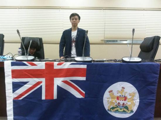 在香港中學生議會選舉中,以132票當選的歐陽耀光,除了是一名中學生外,他亦是“港獨” 組織“學生動源”發起人之一。歐陽耀光的“港獨”心,在香港中學議會的政綱上表露無遺,他寫道,本土理念乃大勢所趨,他希望以中學生身份,把本土立場帶進 中學生議會。昨日,他的選舉承諾果然“兌現”,在首次會議中,他帶著“港英旗”開會,開會后更不忘與旗幟合照,放上facebook。