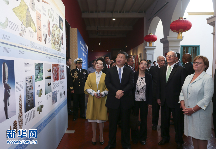 11月21日,國家主席習近平和夫人彭麗媛在利馬同秘魯總統(tǒng)庫琴斯基和夫人蘭格共同出席中拉文化交流年閉幕式并參觀“天涯若比鄰-華夏瑰寶展”。新華社記者 蘭紅光 攝